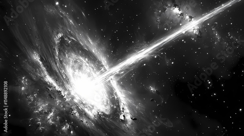 Glowing gamma ray burst in space with intricate quasar details a striking 3d abstract black and white rendering. Quasar. Illustration