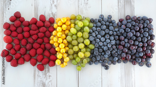 Bogactwo letnich owoców: maliny, jagody i inne świeże oraz mrożone owoce na jasnym drewnianym tle.