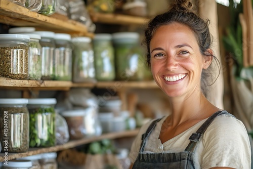 Smiling shopkeeper posing in front of herbs and spices display