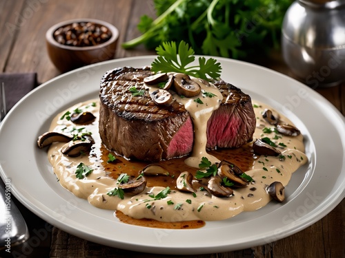 Idealnie grillowany polędwica wołowa podawana z kremowym sosem pieprzowym, ozdobiona natką pietruszki i podawana z pieczonymi pomidorkami koktajlowymi i brokułami.