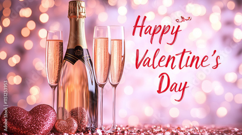 Butelka szampana z kieliszkami, ustawiona na tle pełnym świątecznych akcentów, z napisem „Happy Valentine's Day”, tworząca romantyczny nastrój.