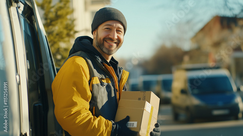 Uśmiechnięty kurier w roboczym stroju, trzymający paczkę w rękach, stojący obok swojego dostawczego samochodu.