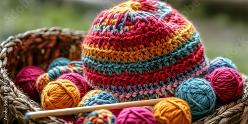 Crochet work featuring cotton yarn, vibrant yarn balls, and crochet needles arranged on a threshing basket. This handmade crochet hat can be styled as a slouch or beanie hat, showcasing exquisite