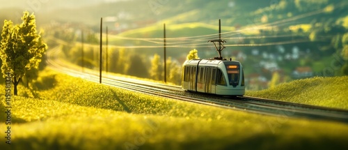 Scenic Train Journey Through Lush Green Fields at Golden Hour