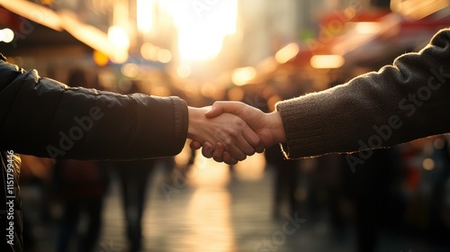 Handshake in Sunrise Over Busy Street