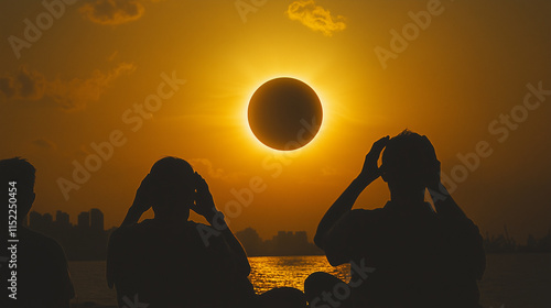 Individuals are enjoying the breathtaking view of a solar eclipse as the sun sets over the water, silhouetting a city skyline against a vibrant sky.