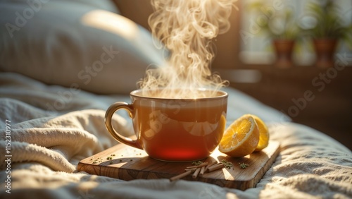 steaming cup of tea with lemon slices on a cozy bed setting