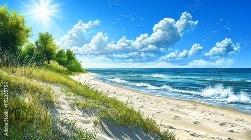 Sunny Beach Landscape: Ocean Waves, Blue Sky, White Sand, Green Grass, Clouds, Sunlight, Coast, Seashore, Nature, Summer