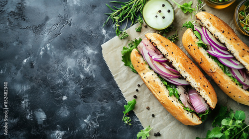 Apetyczne kanapki z kawałkami śledzia, plasterkami cebuli i świeżymi ziołami z wolną przestrzenią na treści.
