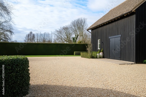 Beautiful resin driveway in front of a large barn with black cladding, surrounded by hedges and grass, in the UK countryside. The driveway is made from a rubber or gravel material.