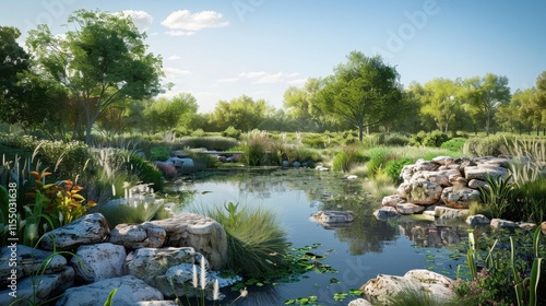 Eco-Park: A sustainable public space featuring solar lighting, native plants, and recycled materials, designed to promote environmental consciousness and nature.