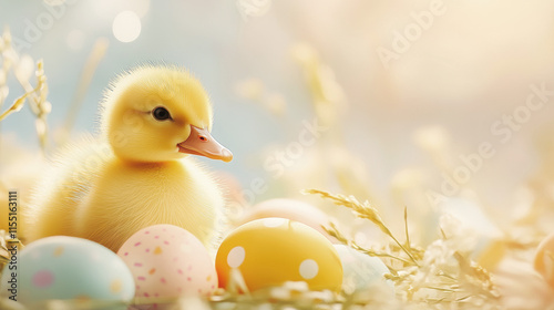 Adorable duckling with colorful easter eggs in sunlit spring meadow