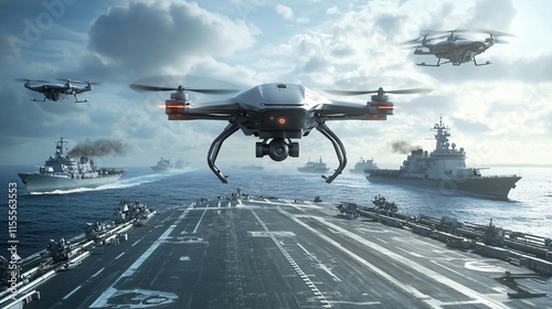 Futuristic Military Drone Launching from Battleship Over Ocean
