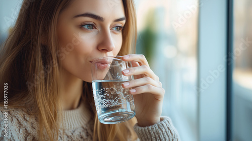 Młoda kobieta w swetrze, stojąca przy oknie, delektuje się szklanką wody, tworząc spokojny i refleksyjny nastrój we wnętrzu.