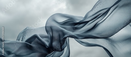 Flowing sheer fabric against a dramatic grey sky creating a dynamic and ethereal atmosphere for creative and artistic themes.