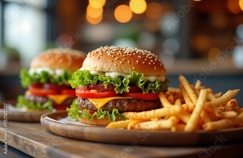 Close up of tasty american burgers, french fries on wooden plate. Delicious fast food. Perfect for hungry people on quick meal snack. Ideal for restaurant menus food delivery apps. Food photography.