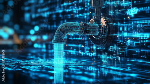 Strumień danych w postaci jasnych cyfrowych linii płynących z nowoczesnego kranu, symbolizuje przepływ informacji w erze internetu i transformacji cyfrowej.