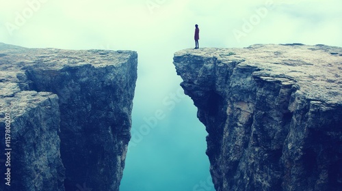 Individual overlooks serene canyon while standing on cliff edge amidst fog and rugged terrain