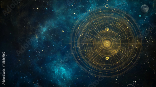Okrągły wykres horoskopowy z dokładnymi pozycjami planet, podziałem na dwanaście domów i zodiak, otoczony delikatnym blaskiem gwiaździstego nieba, tworzący harmonijną i kosmiczną kompozycję.