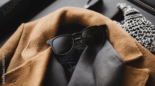Stylish sunglasses resting on folded clothes and gloves, ready for a business trip