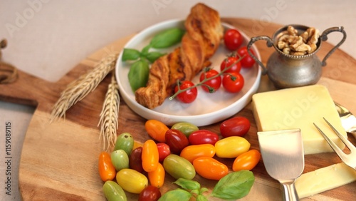 Wooden board with eco-friendly fresh ingredients: multicolored cherry tomatoes, leafy basil, golden cheese slice, walnut bowl, flaky twist pastry. Emphasis on clean, healthy, sustainable food concept.