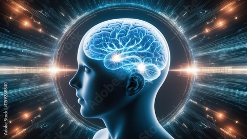 Futuristic depiction of a human brain surrounded by digital elements, symbolizing technology, intelligence, and exploration of consciousness