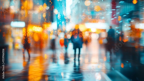 Blurred city street scene at night with rain and people.