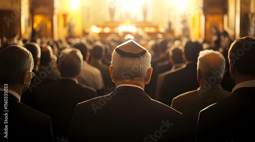 Jewish Worshipers Attending Service in Synagogue with Warm Lighting : Generative AI