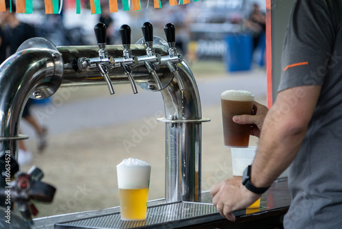 Bar tender sirviendo deliciosa cerveza roja tirada en feria al aire libre