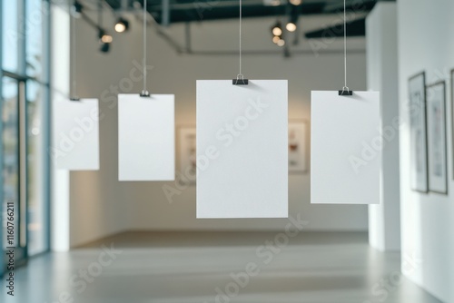 Blank poster mockup mockup. An art gallery with blank canvases hanging, showcasing a minimalist design and bright lighting, inviting creativity and inspiration.