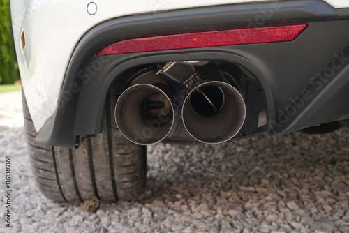 Na zdjęciu widoczny jest tył samochodu, a dokładniej fragment zderzaka wraz z podwójną końcówką układu wydechowego. Auto stoi na podłożu z jasnych kamyków, a obok widać tylną oponę pojazdu.