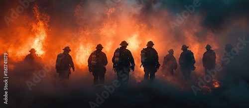 Group of Firefighters in Uniform Standing United Against a Large Fire with Smoke. Panoramic Composition Showcasing Teamwork and Heroism