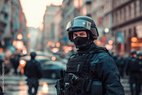 Police in riot gear, special force person tactical gear standing in an urban city environment concept of law enforcement in city