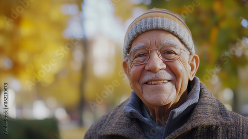 Uśmiechnięty starszy mężczyzna, delektujący się chwilą spokoju na zewnątrz, z wyrazem radości i wewnętrznego spokoju, otoczony przyjemnym krajobrazem.
