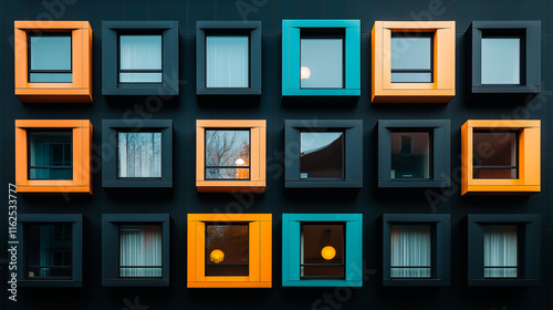 Colorful apartment building facade with many windows and balconies.