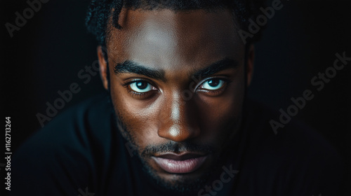 Mężczyzna z hipnotyzującymi oczami, uchwycony w surowym świetle pojedynczej lampy, która podkreśla kontrast między światłem a cieniem.
