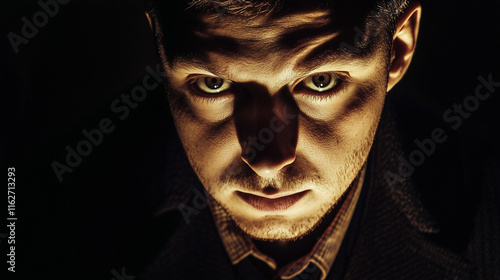Mężczyzna z hipnotyzującymi oczami, uchwycony w surowym świetle pojedynczej lampy, która podkreśla kontrast między światłem a cieniem.