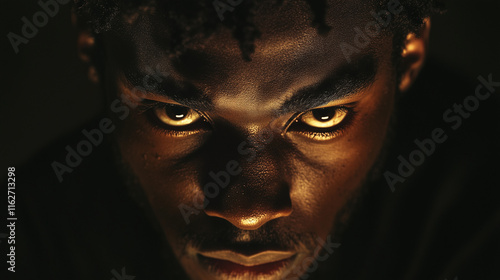 Mężczyzna z hipnotyzującymi oczami, uchwycony w surowym świetle pojedynczej lampy, która podkreśla kontrast między światłem a cieniem.