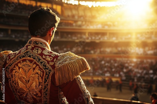 Majestic matador in traditional attire captured against a sunset in a vibrant bullfighting arena