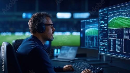 Office specialist seen up-close in modern monitoring control room working on desktop computer Manager types navigates with mouse amidst digital screens