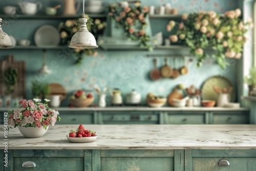 Vintage green kitchen with flowers strawberries pendant lights crockery.