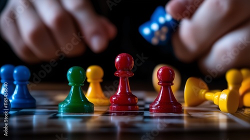 Gra planszowa z kolorowymi pionkami i rzutem kostką