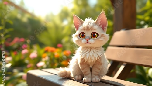 A charming LaPerm cat with soft, curly fur and expressive almond-shaped eyes, sitting elegantly on a wooden bench, bathed in natural sunlight with a garden backdrop.