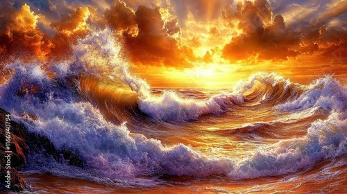 Vibrant sunset over dramatic ocean waves crashing on shore.