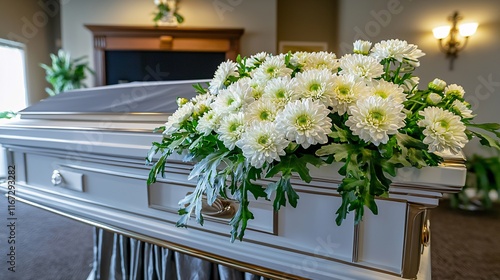 shot of chrysanthemums in a funeral arrangement, emphasizing the solemnity and respect. | Chrysanthemum