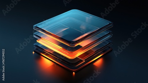 Stacked glowing translucent glass squares on dark background.