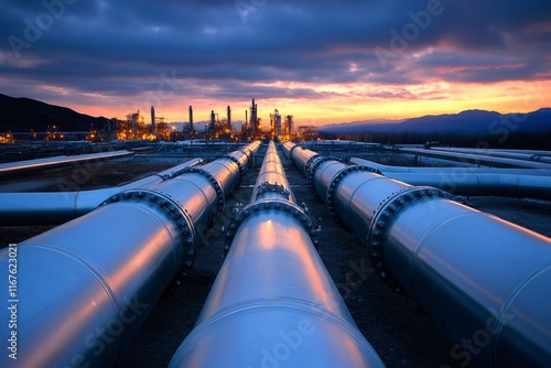Pipelines transporting gas and oil at sunset near refinery plant
