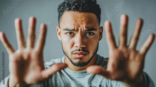 A stern-faced man firmly says “NO” while emphasizing rejection with strong hand gestures. His serious facial expression and assertive body language convey determination and refusal.
