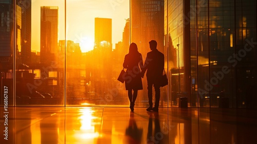 Silhouetted couple holding hands, gazing at sunset over city skyline, viewed through large window.