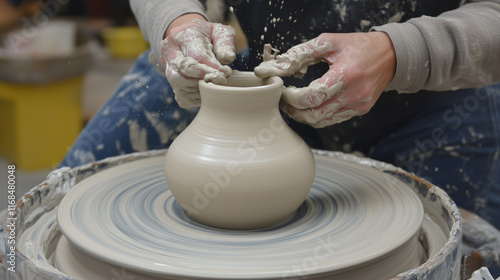 Garncarz skupiony na pracy obraca wazon na kole garncarskim, a mokra glina wiruje w powietrzu, tworząc żywiołowy, artystyczny moment.